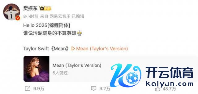今天的凌晨 1 点钟,樊振东发文,宽待 2025 年的到来:" Hello 2025 [ 锦鲤附体 ] 。谁说污泥周身的不算骁雄。"这段笔墨既有对新年的拥抱,也有勇于对不公反水的坚握!