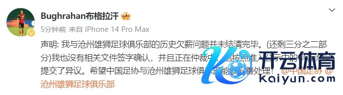 客岁1月,布格拉汗还曾发声明称他与沧州雄狮还有历史欠薪问题,他暗意:“我与沧州雄狮足球俱乐部的历史欠薪问题并未结清杀青。(还剩三分之二部分)我也莫得联系文献署名阐明,况且正在仲裁中,也按照准入公示中的陈说历程提交了异议。但愿中国足协与沧州雄狮足球俱乐部省略妥善措置! @中国足协 @沧州雄狮足球俱乐部 ”