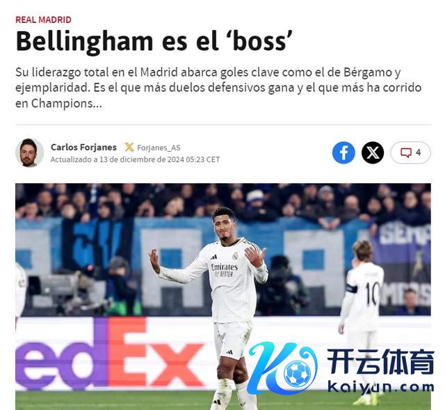 “贝林厄姆,皇马的新BOSS(不错通晓为一哥)”,13日的《阿斯报》,撰文赞叹身价1.8亿欧元的英格兰巨星。在皇马,贝林厄姆普及为万能战士:进球、传球、驻防、跑动,无所弗成体育集锦,尽显魁首气质。