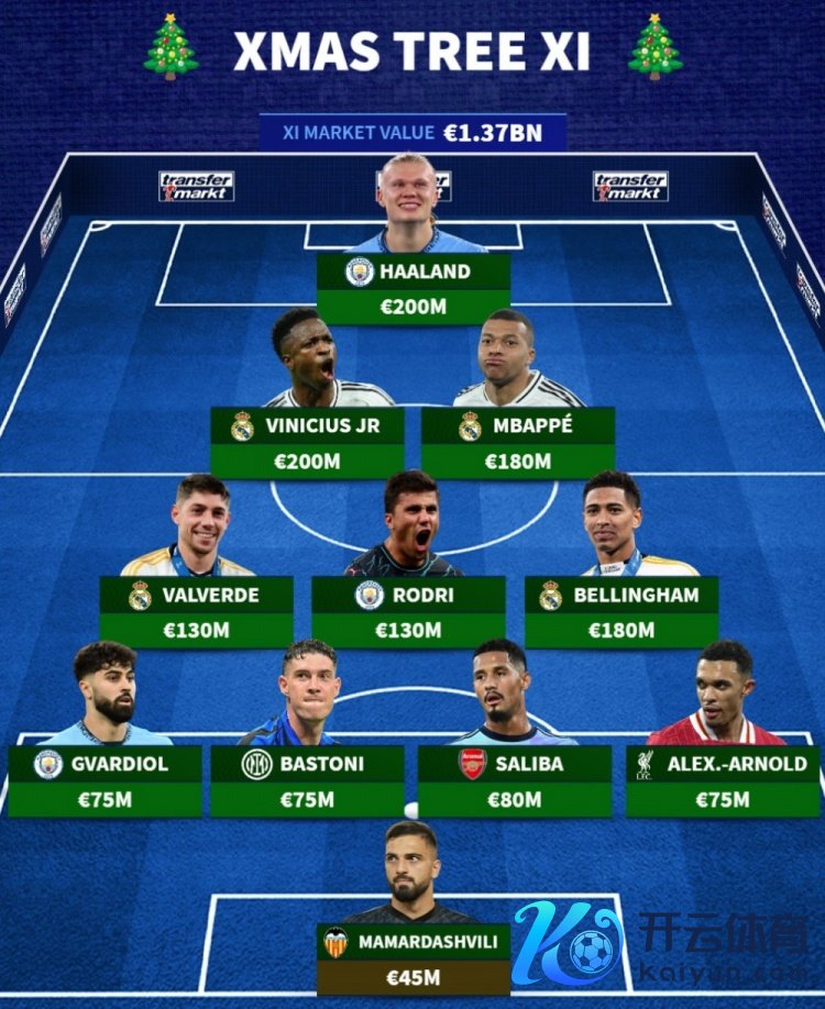 12月24日讯 圣诞节将至,《转会市集》也列出了一套在本年存在感齐备的“圣诞树阵型”,皇马4将、曼城3东说念主。