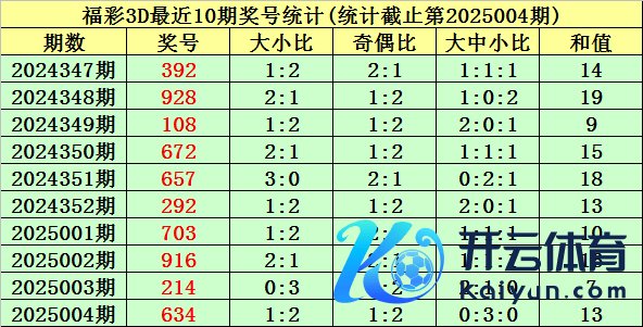 开奖回来:福彩3D第2025004期奖号为:634。奖号类型为组六,和值为13,奇偶比为1:2,跨度为3,012路比为2:1:0,大小比为1:2。